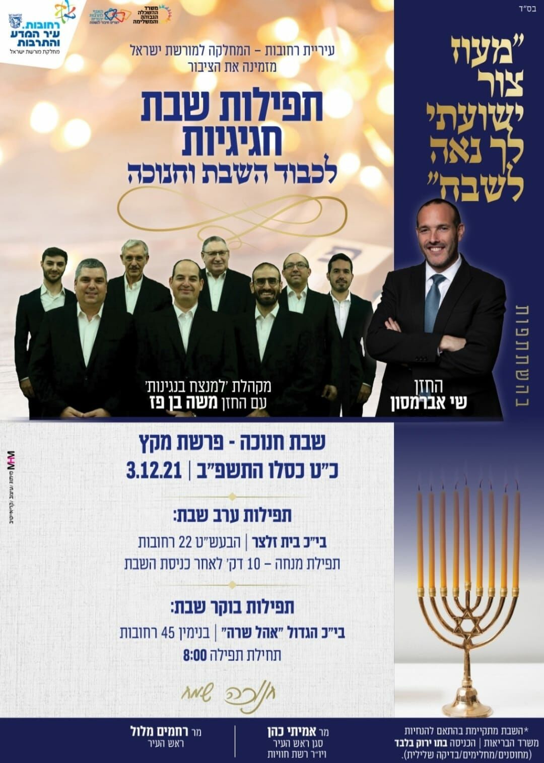 ביוזמת סגן ראש העיר אמיתי כהן ומחלקת מורשת ישראל בעיריית רחובות תתקיים בשבת הקרובה, שבת חגיגית עם תפילות שבת מוזיקאליות בהשתתפות הפייטן יובל טייב והחזן הצבאי הראשי שי אברמסון , אותו תלווה מקהלת "למנצח בנגינות" והחזן משה פז אשר ינעימו את תפילות השבת והחנוכה בשירה וזמרה .