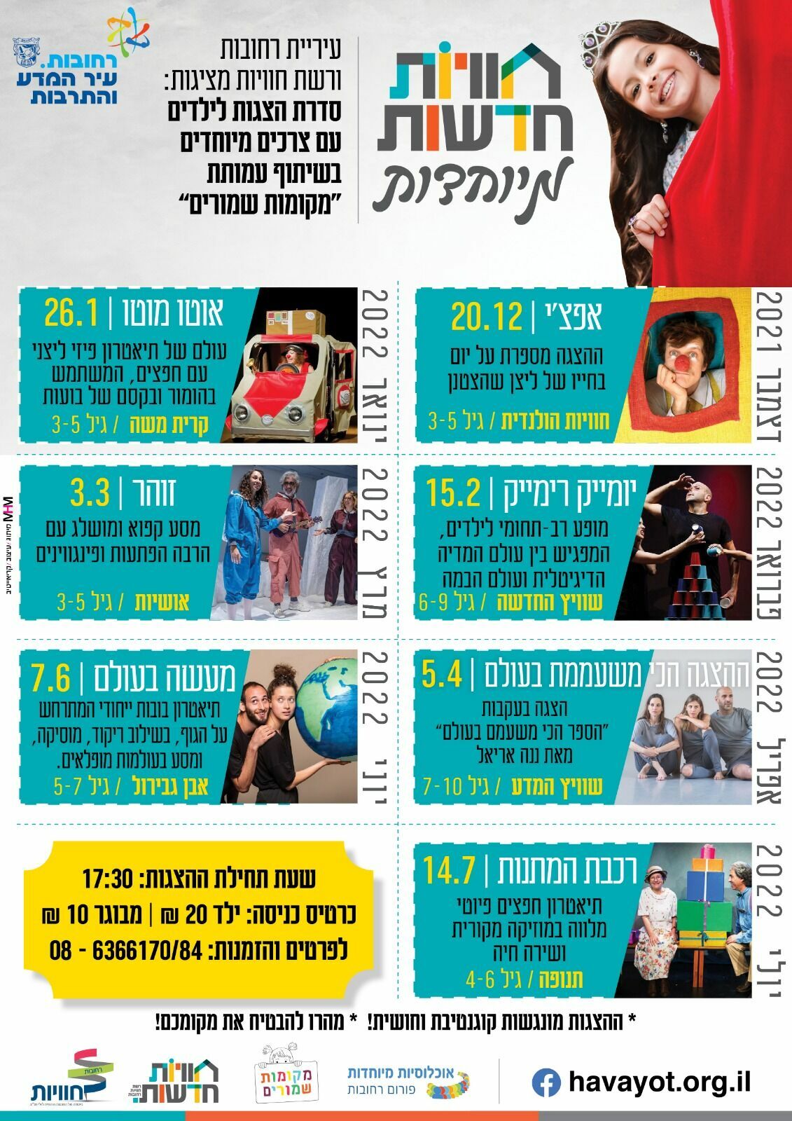 ההצגות יתקיימו במרכזי הקהילתיים ברחובות ההולנדית, קריית משה, שוויץ רחובות החדשה, אושיות, שוויץ המדע, אבן גבירול ותנופה במהלך החודשים דצמבר 2021 ועד יולי 2022.