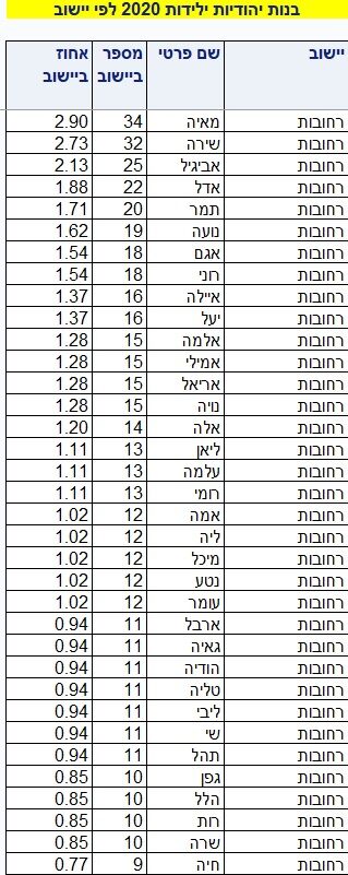 השם הנפוץ. ביותר ברחובות לבנים בשנת 2020 הוא אריאל ולבנות מאיה