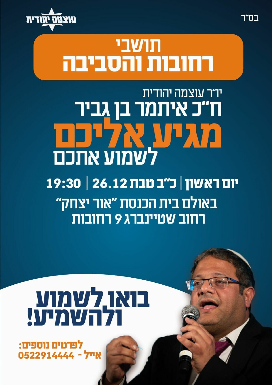 ביום ראשון 26.12 ח"כ איתמר בן גביר מגיע למפגש עם תושבי רחובות