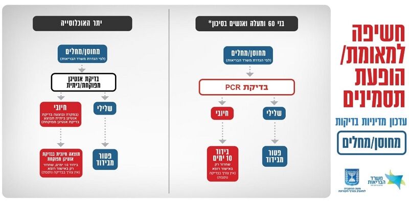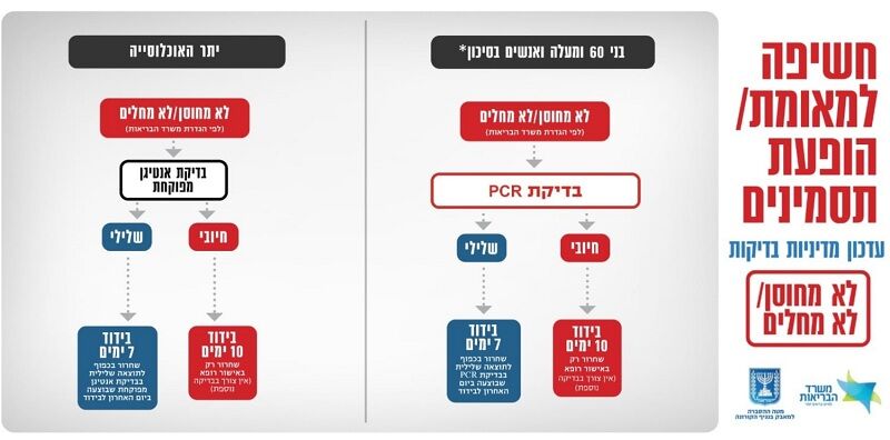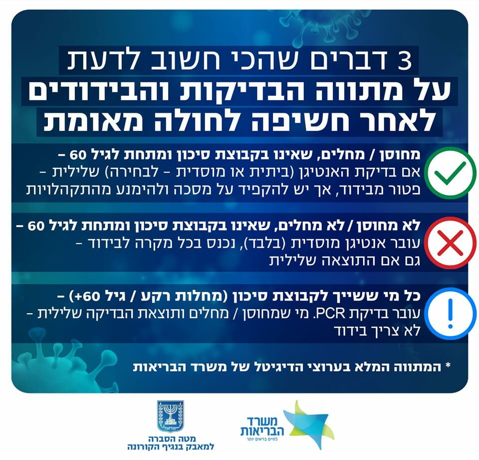 תזכורת ביום שישי 7.1 נכנס לתוקף מתווה הבדיקות החדש במסגרתו בדיקות ה PCR יתבצעו רק לבני 60+ ולאוכלוסייה בסיכון. שאר האוכלוסייה תבצע בדיקות אנטיגן ביתיות/ מוסדיות בהתאם לקריטריונים של מחלים/ מחוסן/ לא מחוסן