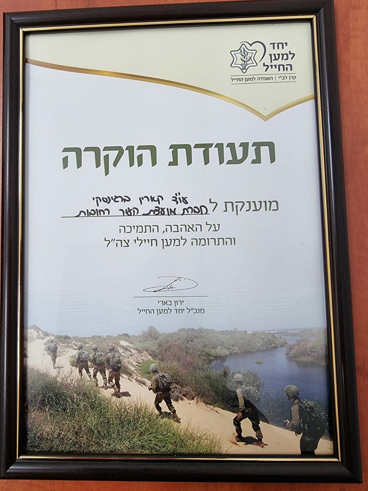 היום באמצע יום גשום ודי מוצף במיוחד בפארק המדע, בתקופת הבידודים, באמצע גל קורונה, התרגשתי מאד בעת שהגיע למשרדי נציג האגודה למען החייל והעניק את תעודת ההוקרה שעבורי מסמלת המון דברים במיוחד כנבחרת ציבור. מחבקת אתכם חיילים יקרים. תודה על הזכות".