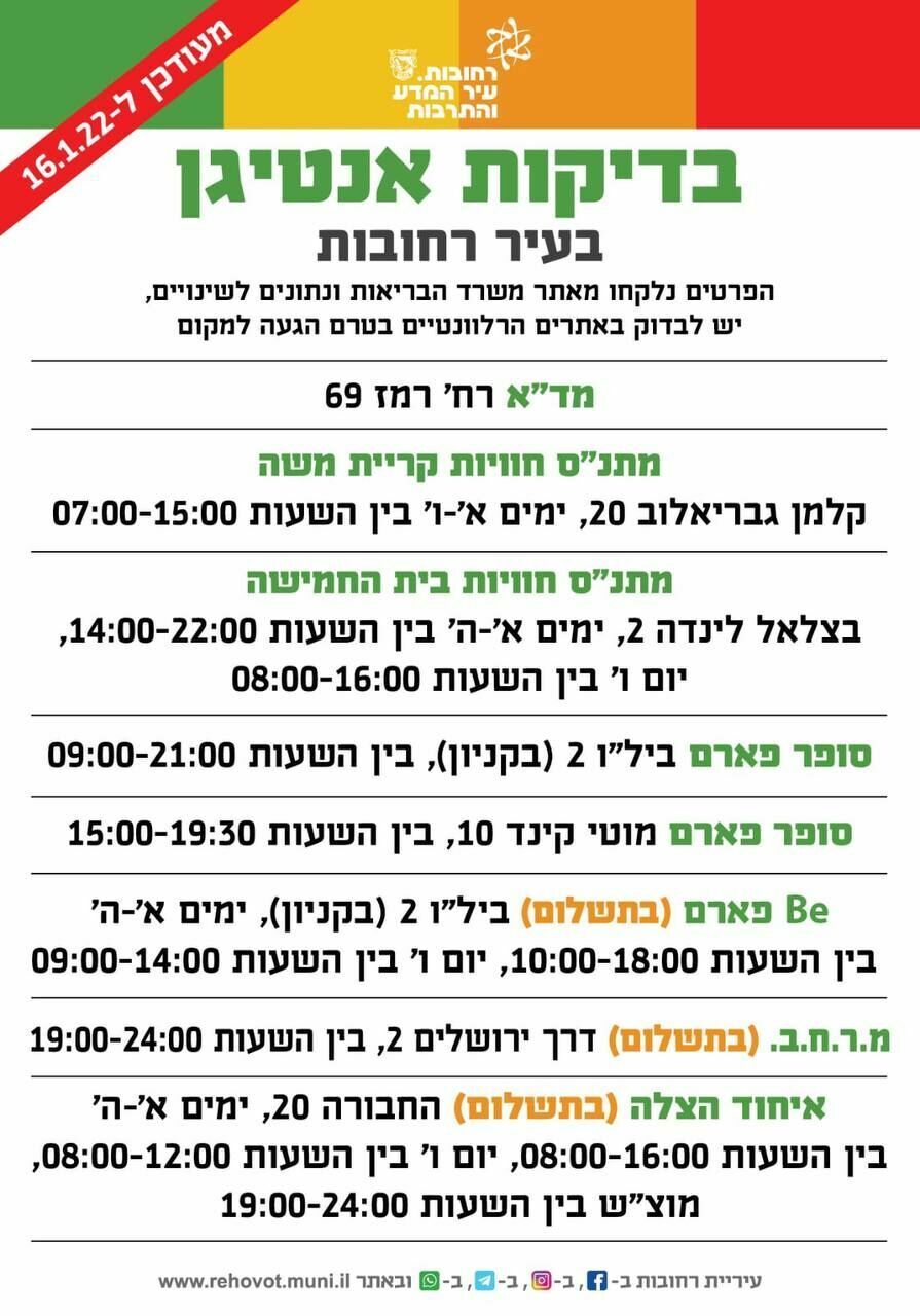 נתוני הקורונה ברחובות ליום ראשון 16.1.22