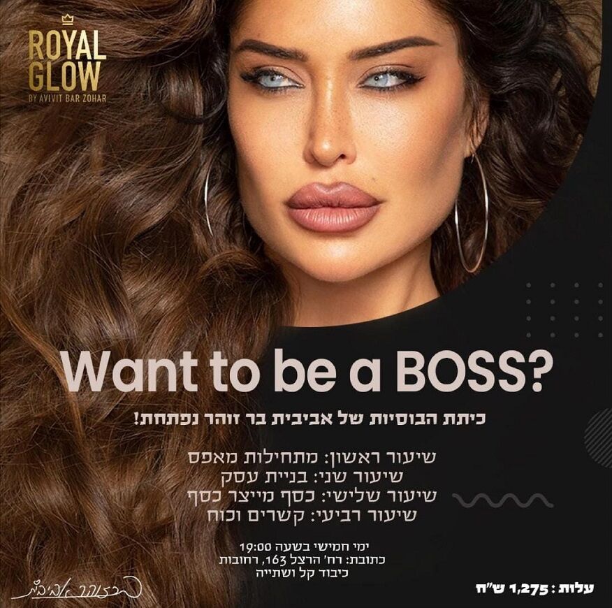 אביבית בר זוהר פותחת קורסים ברחובות! לקראת פתיחת חנות המותג החדש שלה "ROYAL GLOW" ברחובות, אביבית בר זוהר פותחת שני קורסים לנשים: קורס הדיוות וכיתת הבוסיות בה ילמדו נשים על הצלחה, בניית עסק, טיפוח, השגת מטרות ועוד