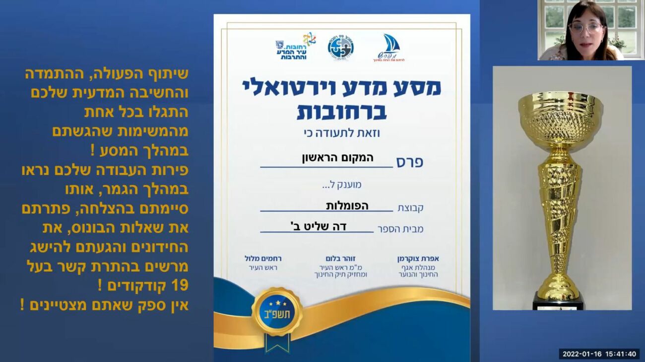 קבוצת "הפומלות" מחט"ב דה שליט ב', קבוצת "גמבה סטייל" מחט"ב קציר ב' וקבוצת "הטוסטרים המעופפים" מחט"ב מדעים ברחובות זכו במקומות הראשונים בפעילות מסע מדע וירטואלי 2 העירוני