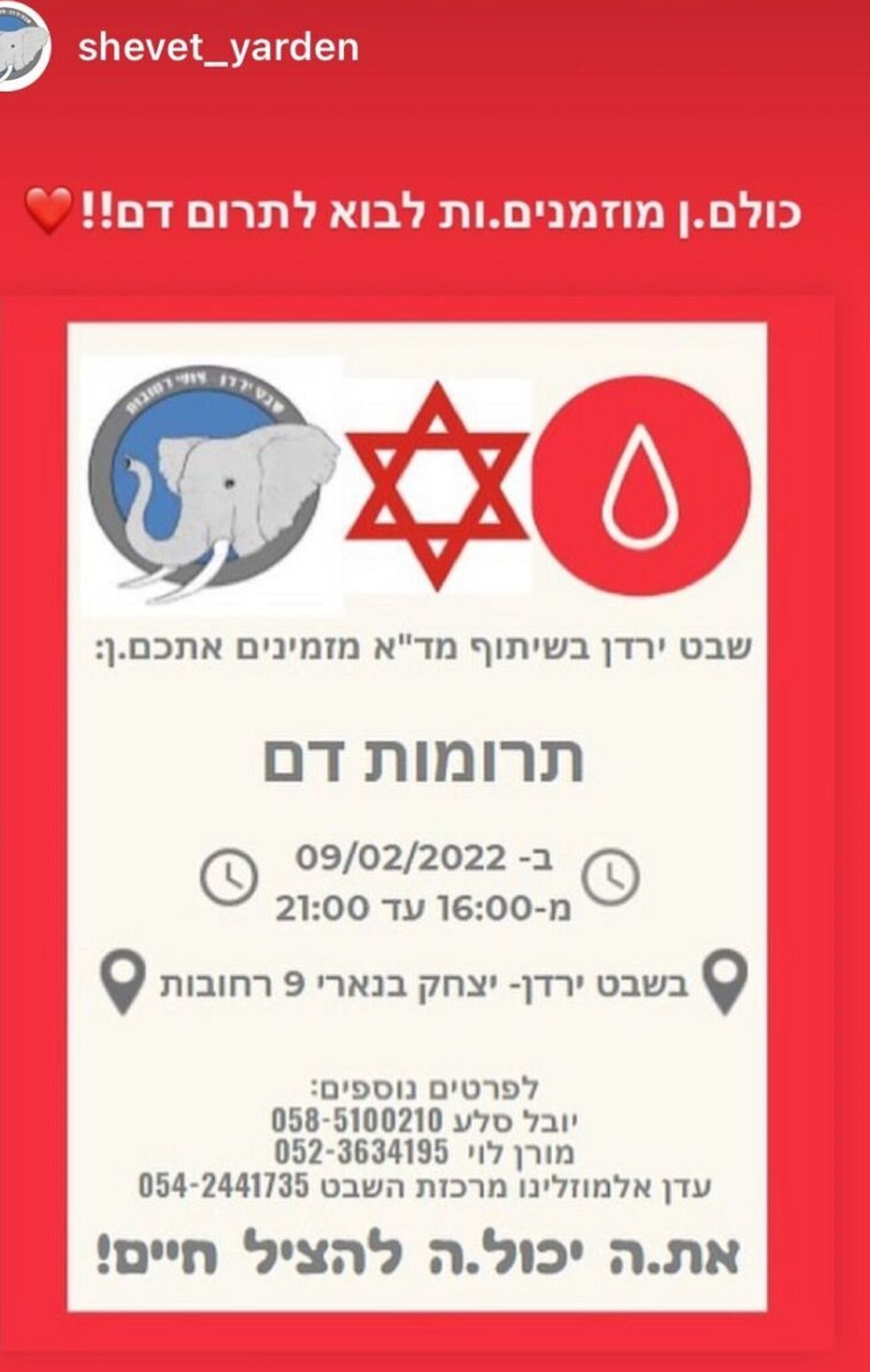 לאור המחסור החמור במנות דם שבט ירדן ברחובות יערוך מבצע התרמת דם ביום רביעי 9.2 בסניף השבט