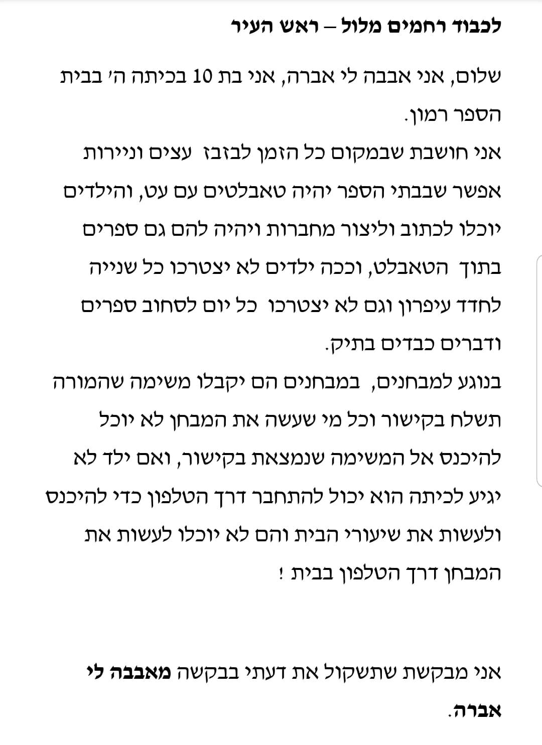 תלמידת ביה"ס רמון ברחובות, לי אבבה אברה בת 10, שלחה מכתב לרחמים מלול בו בקשה לעבור ללמידה בטאבלטים ובכך יתרמו לסביבה בכך שלא יכרתו יותר עצים לצורך הדפסת הספרים והמחברות וכן יימצא פתרון למשקל הכבד של תיקי התלמידים ושמחה לגלות כי מתייחסים ברצינות למכתב