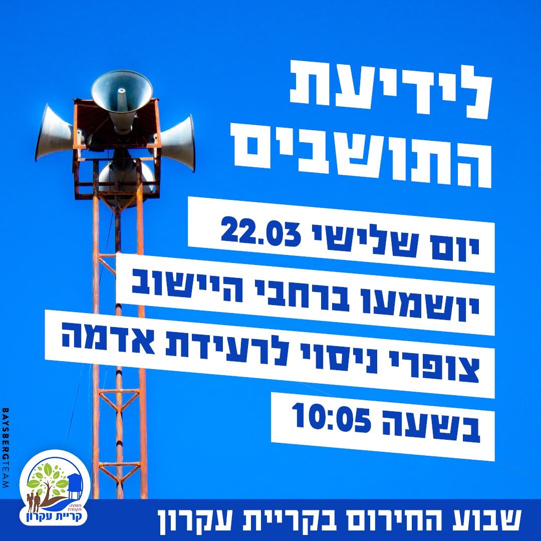 זה רק תרגיל! כחלק מהיערכות לשעת חירום ביום שלישי 22.3 תופעל מערכת צופרי רעידת האדמה בקריית עקרון