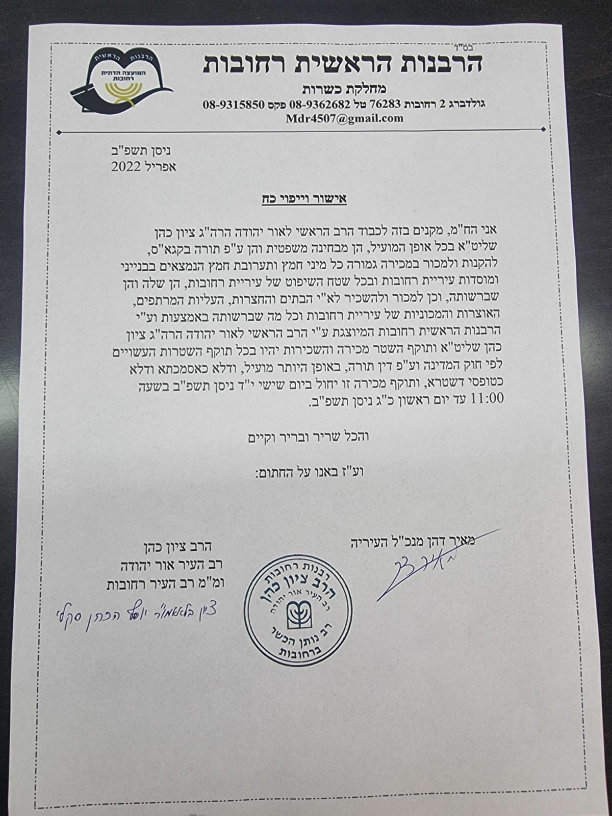 מנכ"ל העיריה, מאיר דהן, חתם במהלך פגישה עם הרב ציון כהן על כתב מכירת החמץ של כל מוסדות העיריה, מוסדות הציבור, מבני הקהילה ומוסדות החינוך והמרחבים הציבוריים בעיר. בכך הועבר החמץ לרב, כמיטב המסורת היהודית לביעור החמץ ומכירתו לגוי. כנהוג, הרב יעביר את כל החמץ של העיר למכירה לגויים לפני כניסת חג הפסח.
