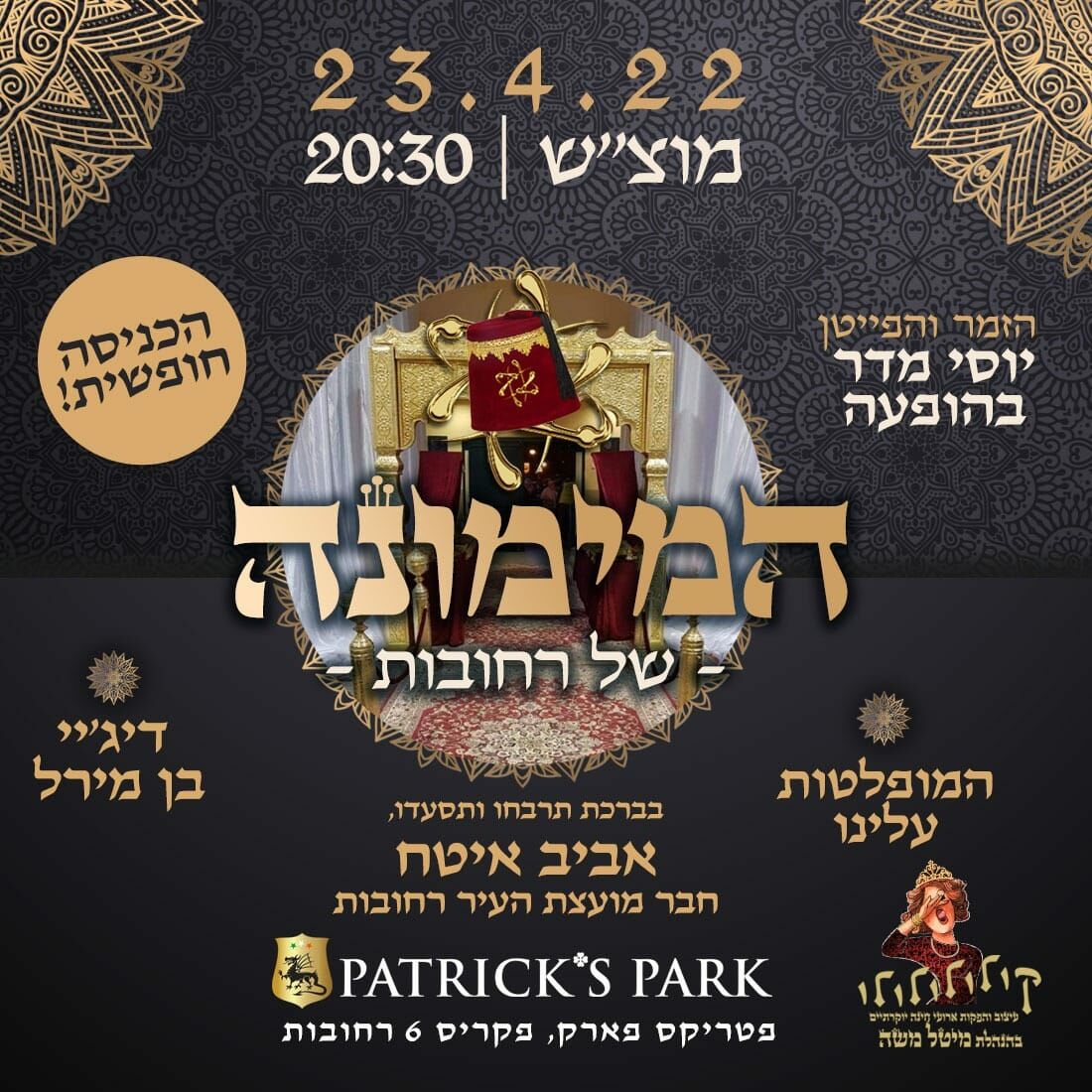 במוצ"ש 23.4 תתקיים בפטריקס רחובות חגיגת המימונה של אביב איטח עם הופעה של הזמר והפייטן יוסי מדר. הציבור מוזמן!