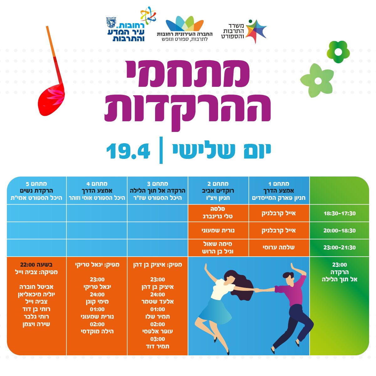 הערב (שלישי 19.4) יפתח פסטיבל "רוקדים אביב ברחובות" במופע המרכזי של אבי טולדנו, שרון חזיז, אילנית, מתחמי הרקדות ועוד