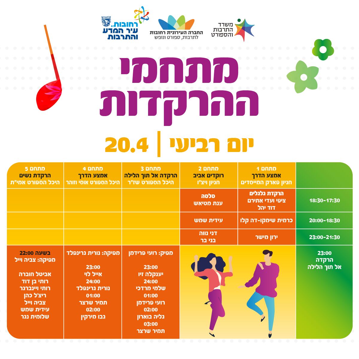 במסגרת הפסטיבל, שהפך בשנים האחרונות למסורת, יוקמו שני מתחמי הרקדות בפארק לקהל הרחב בין השעות 20:00-17:30 של ריקודים סלונים, ריקודי עם מכל הזמנים, סלסה, זומבה, ריקודי הורים וילדים, מחול על גלגלים ועוד. בתום המופעים המרכזיים יימשכו ההרקדות אל תוך הלילה הן בפארק והן באולמות ספורט ברחבי העיר – החל מהשעה 22:00 תתקיים הרקדת נשים בהיכל הספורט אמי"ת עמיחי, ובשעה 23:00 מוזמנים חובבי הריקוד לאולם הספורט בבי"ס שז"ר ואולם "אוסי וזוהר" בצעדי ריקוד קלילים.