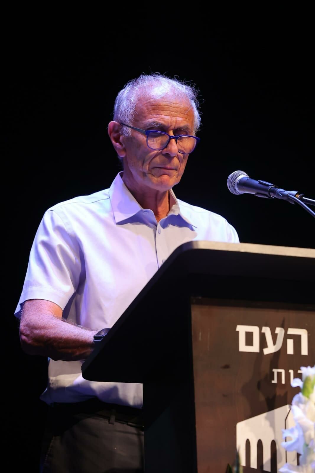 רחמים מלול בעצרת המרכזית ברחובות ליום השואה "על מסילות הקדמה דהר קטר המוות, על אדני הטכנולוגיה המתפתחת גוועה האנושיות"