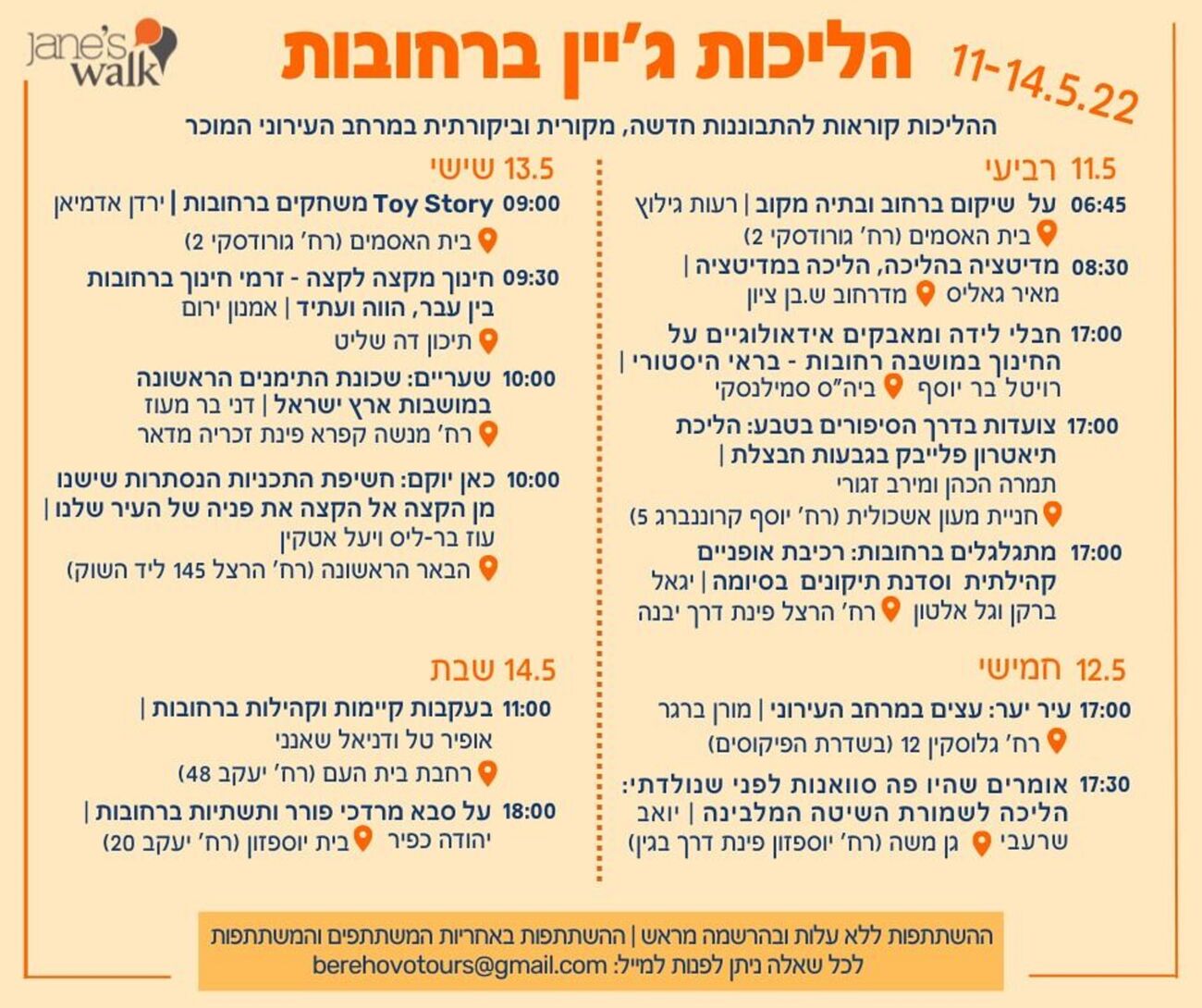 פסטיבל הליכות ג'יין ברחובות חוזר! בימים רביעי-שבת 11-14.5 יחלו אירועי הפסטיבל הכוללים סיורי ברחבי העיר, רכיבת אופניים, מדיטציה ועוד - לינק להרשמה מצ"ב בכתבה