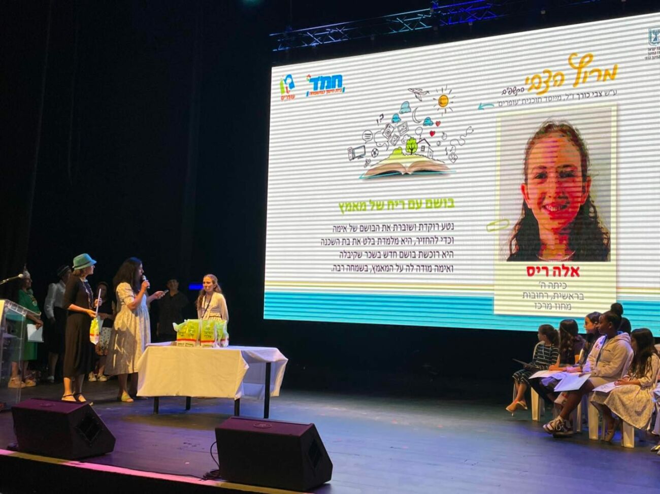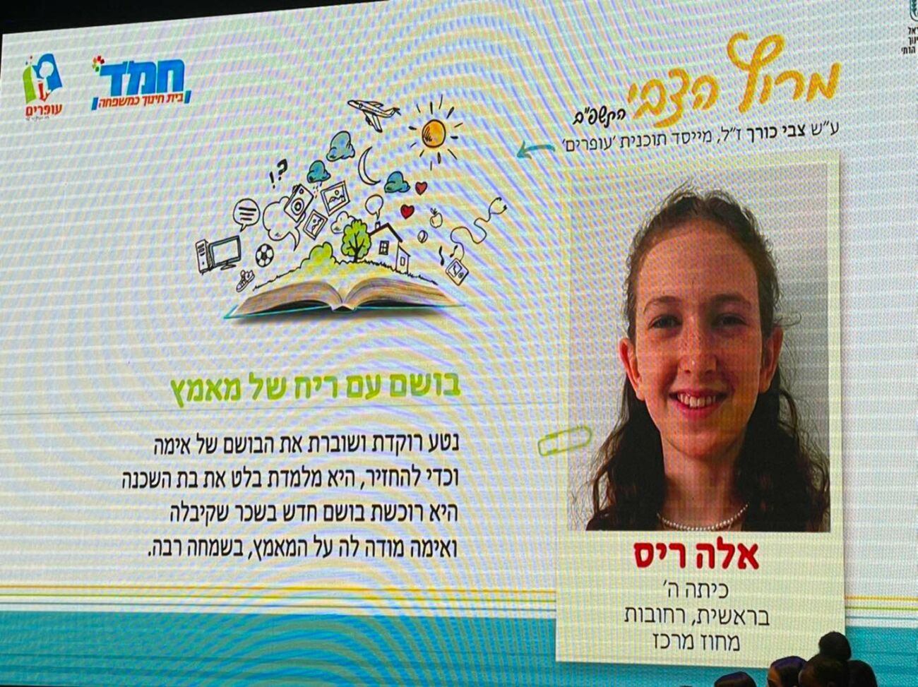 טקס חגיגי להענקת הפרסים התקיים השבוע בו לקחו חלק כל הכותבים הצעירים שזכו במקומות הראשונים על פי מחוזות. בין הזוכים נמצאת תלמידת בית ספר בראשית ברחובות- אלה ריס, כתבה את הסיפור בושם עם ריח של מאמץ: נטע רוקדת שוברת את הבושם של אימה וכדי להחזיר, היא מלמדת בלט את בת השכנה ורוכשת בושם חדש בשכר שקבלה. אימה מודה לה על המאמץ בשמחה רבה.