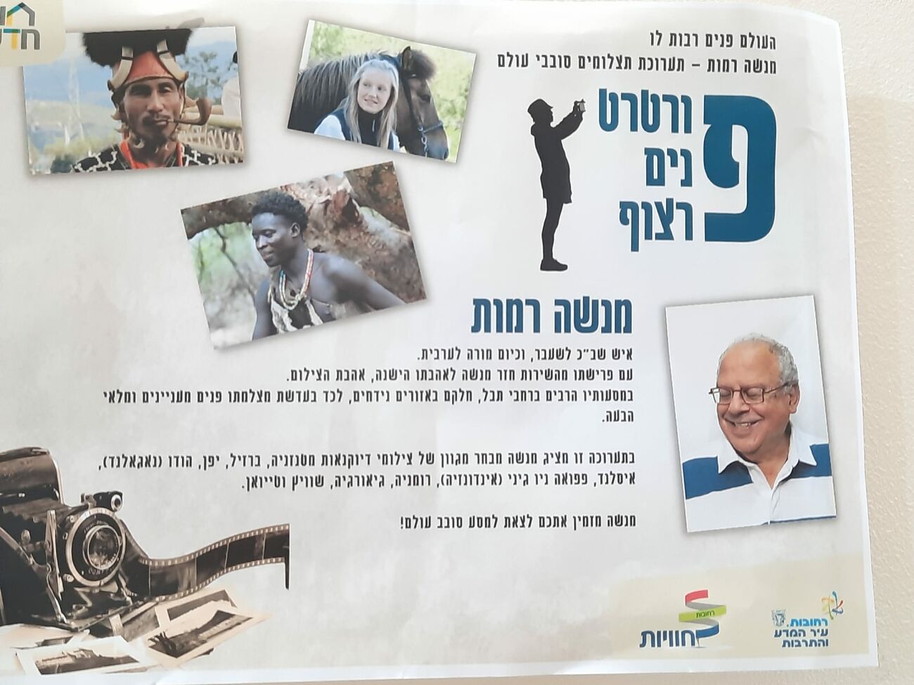תערוכה חדשה בגלריה הקהילתית במתנ"ס שוויץ המדע. בימים אלו מוזמנים התושבים לצאת למסע ברחבי העולם בתערוכת הצילומים החדשה של מנשה רמות המוצגת במתנ"ס - "העולם- פנים רבות לו", דמויות מרתקות מרחבי העולם שצילם מנשה רמות, איש שב"כ לשעבר וכיום מורה לערבית. עם פרישתו מהשירות חזר משה לאהבתו הישנה- הצילום. במסעותיו ברחבי העולם הצליח מנשה ללכוד בעדשת המצלמה פנים מעניינים ומלאי הבעה מטזניה, ברזיל, הודו, רומניה, גיאורגיה, שוויץ ועוד.