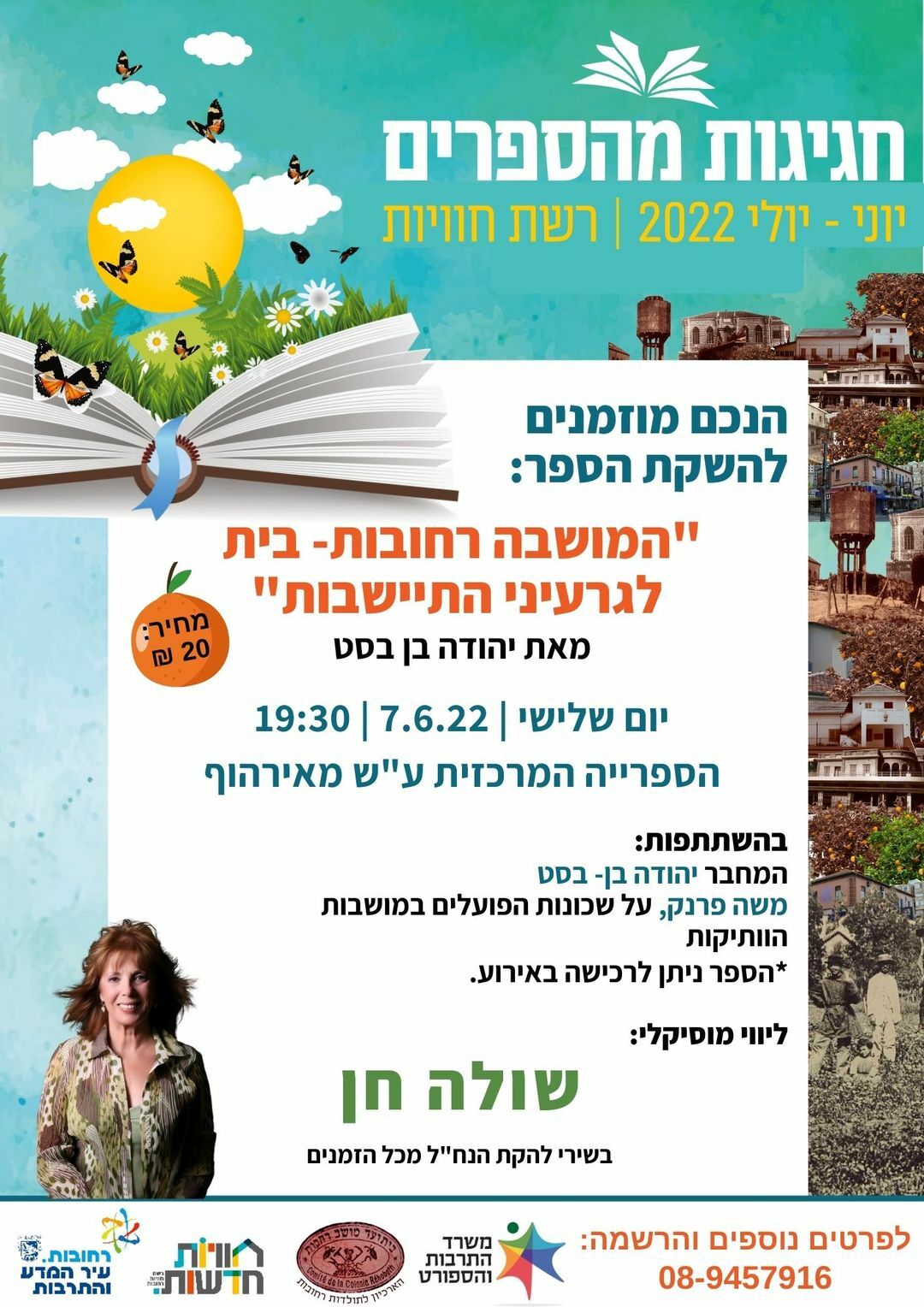 • השקת הספר "המושבה רחובות- בית לגרעיני התיישבות" מאת יהודה בן בסט בהשתתפות: המחבר יהודה בן- בסט, שמואל ורון- רכז שנת השירות של השומר הצעיר. ליווי מוסיקלי שולה חן- בשירי להקת הנח"ל מכל הזמנים | מבוגרים | ג' 7.6.2022 | 19.30 | 20 ₪ | הספרייה המרכזית ע"ש מאירהוף