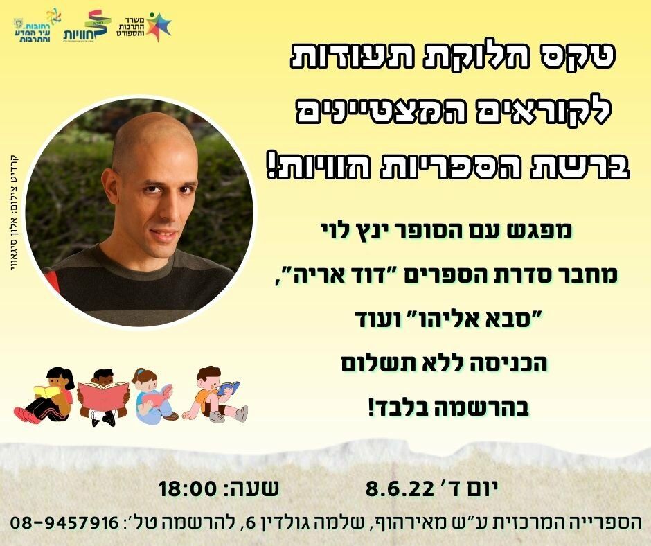 • טקס חלוקת תעודות לקוראים המצטיינים ברשת הספריות ומפגש עם הסופר ינץ לוי מחבר סדרת "דוד אריה", "סבא אליהו" ועוד | לכל הגילאים | יום ד' 8.6.22 | 18:00 | הכניסה חופשית | הספרייה המרכזית ע"ש מאירהוף
