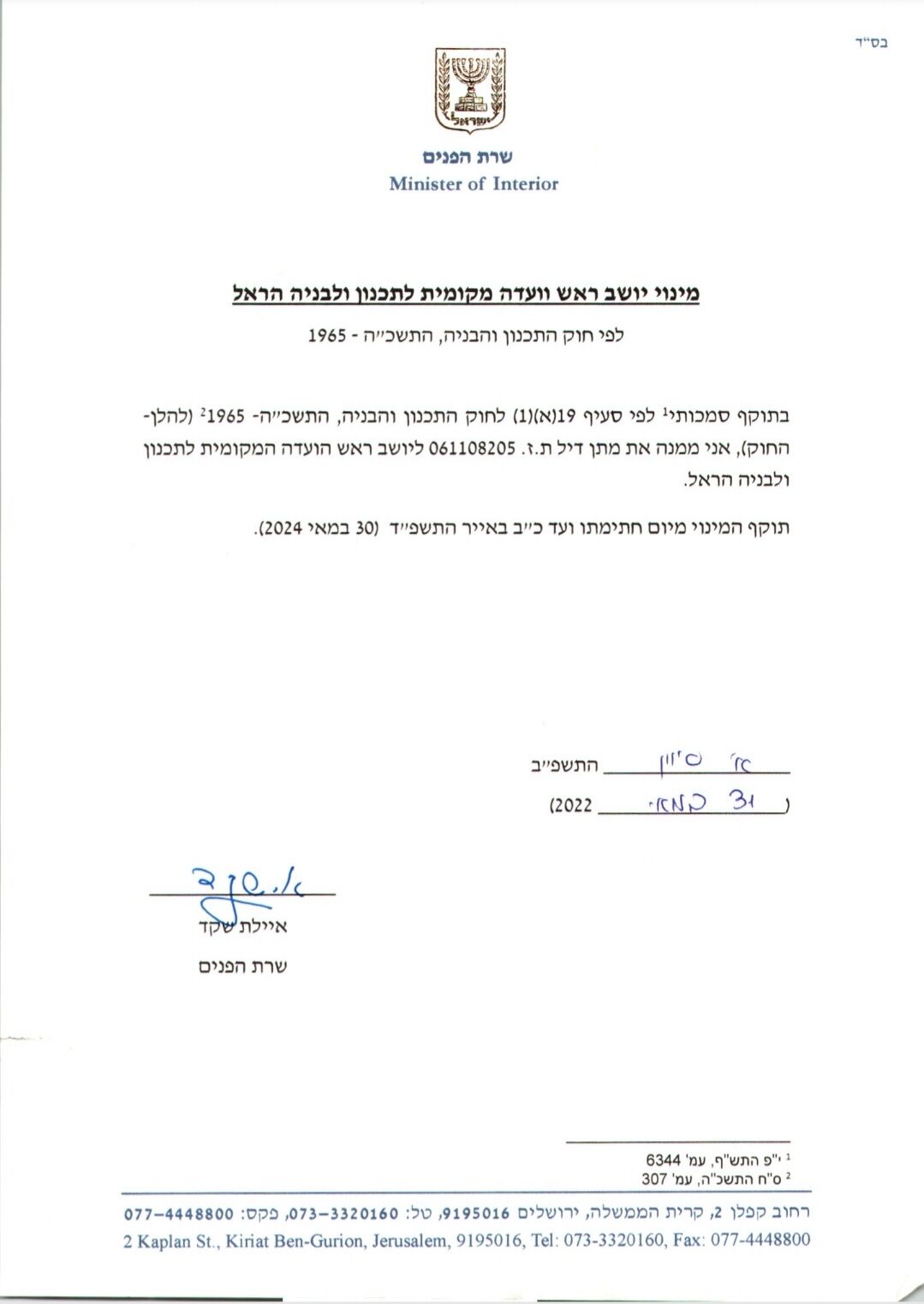 איילת שקד מינתה את מתן דיל לתפקיד יושב ראש הוועדה המרחבית לתכנון ובנייה "הראל" האחראית על היישובים מבשרת ציון, אבו גוש וקריית יערים.