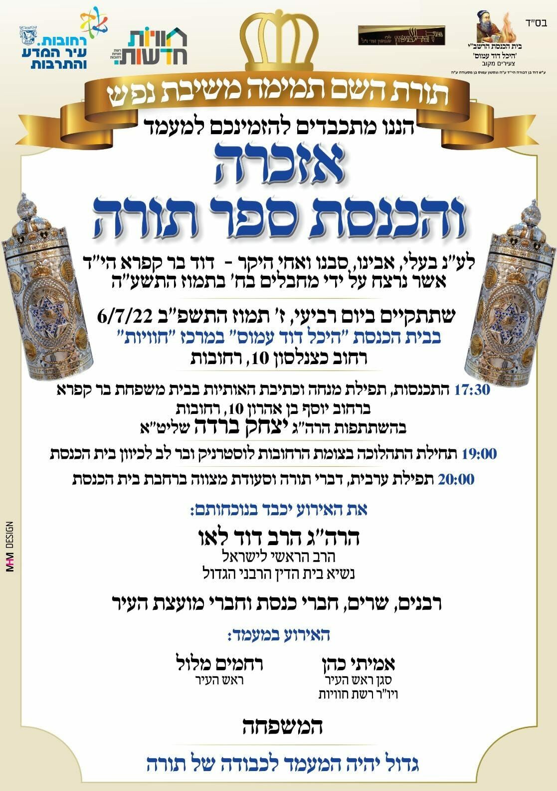 ביום רביעי 6.7 תתקיים בבית הכנסת, היכל דוד עמוס ברחובות אזכרה וטקס הכנסת ספר תורה לזכרו של דוד בר קפרא ז"ל שנרצח על ידי תושבי השטחים בשנת 2015