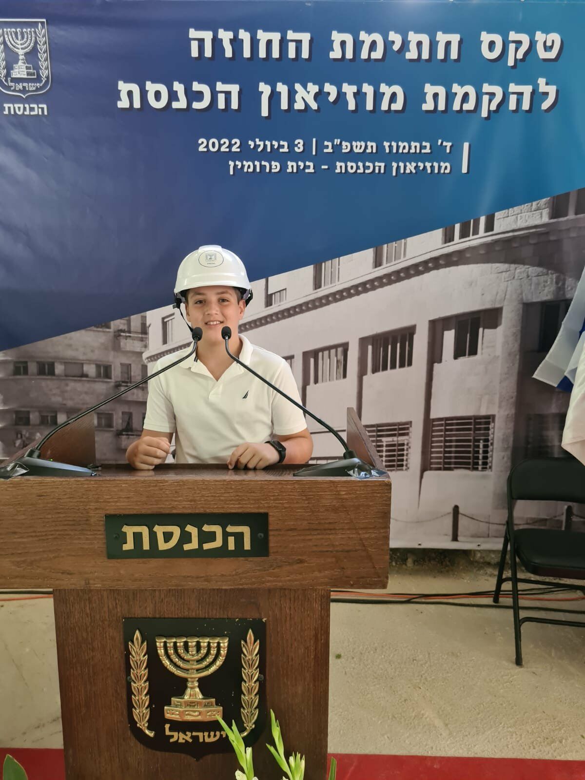 החזון שכתב איתן הגיע עד ליו"ר הכנסת, שהתרגש ממנו מאוד והחליט להזמין את איתן שלנו לנאום בטקס הנחת אבן הפינה של המוזאון ולהקריא חלק קטן מחזונו. איתן הנרגש עלה ונאם מול המכובדים בטקס וייצג את העיר רחובות בכבוד.