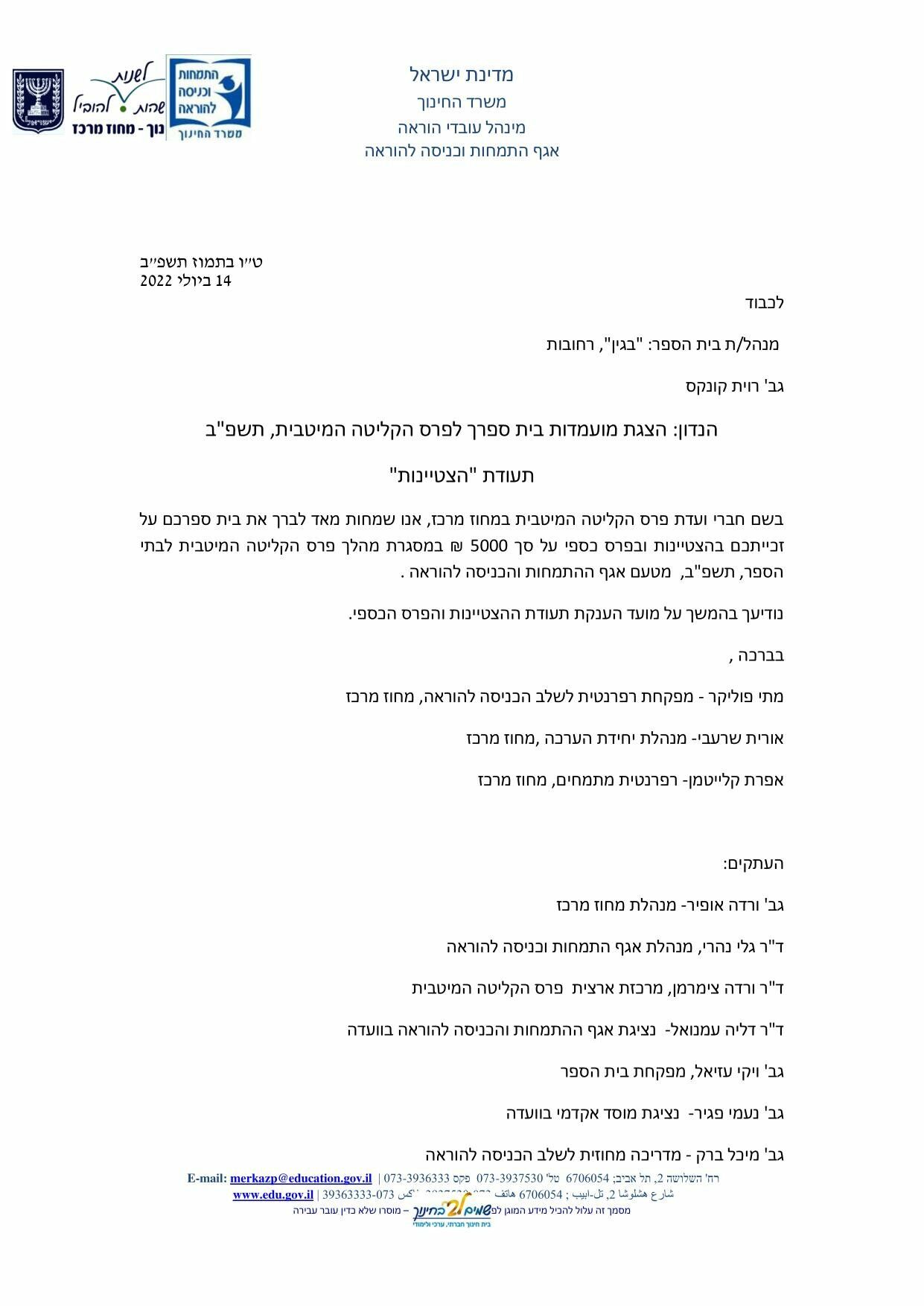 בית ספר בגין ברחובות זכה בפרס הקליטה המיטבית של משרד החינוך עבור מצוינות בקליטה ראויה של מורים חדשים