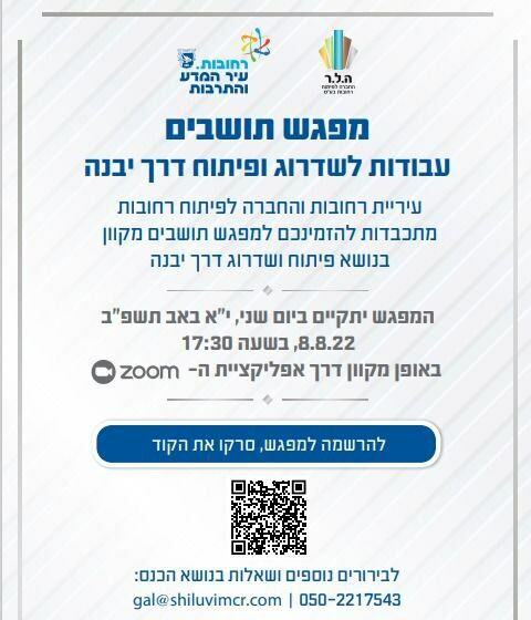 ביום שני 8.8 יתקיים מפגש תושבים בזום בנושא פיתוח דרך יבנה ברחובות