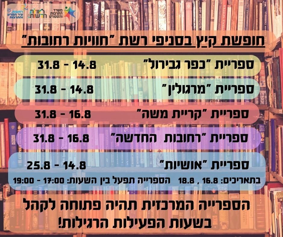 לתשומת לב תושבי רחובות לרגל יציאה לחופשת הקיץ יחולו שינויים בפעילות ספריות רשת חווית ברחבי העיר.