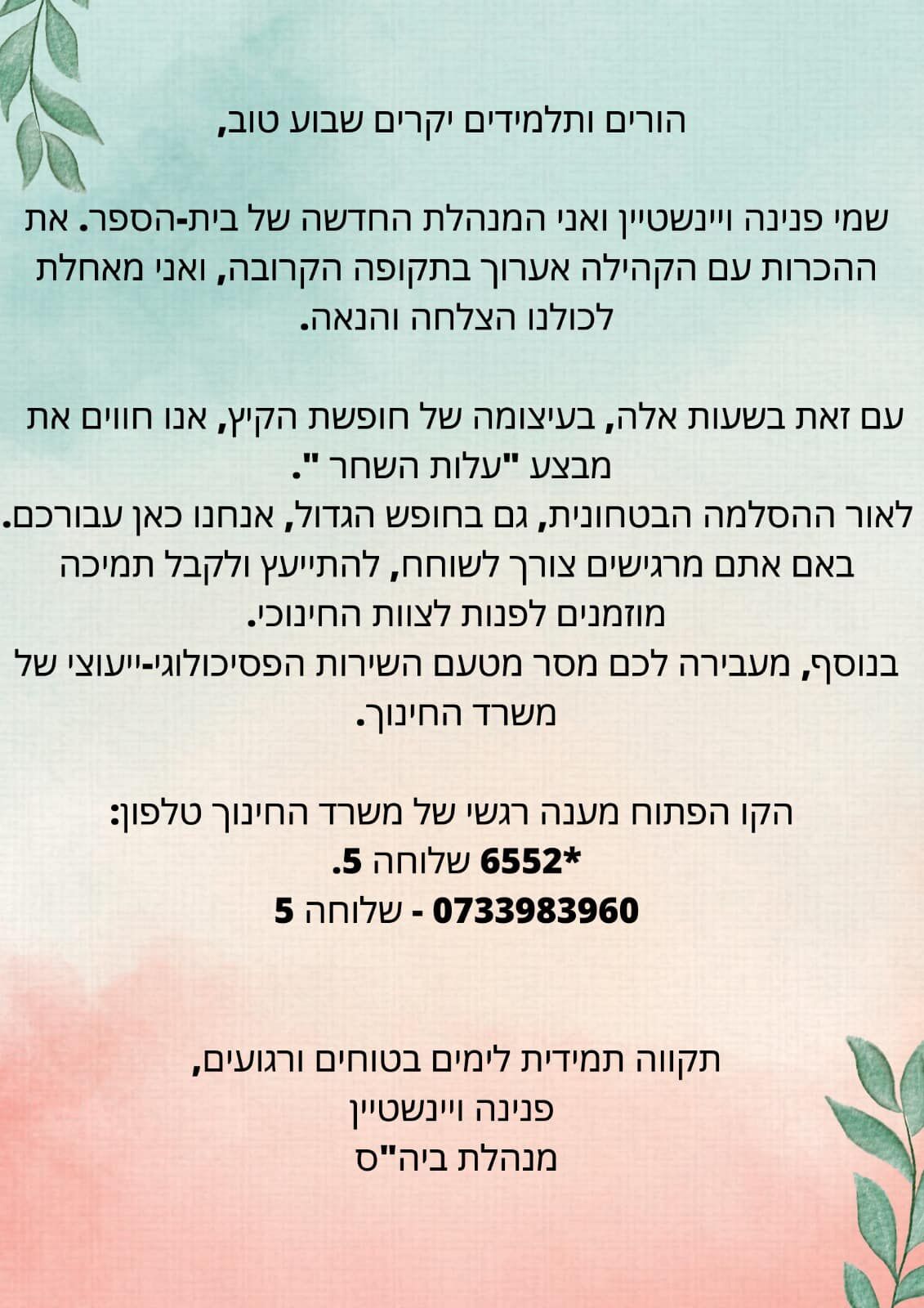פנינה ויינשטיין, תיכנס לתפקידה החדש בתחילת שנת הלימודים לאחר שכיהנה במשך 7 השנים האחרונות כמנהלת בית ספר היובל באשדוד. בבית הספר היא הובילה מגוון תוכניות חינוכיות ובית ספריות, תלמידים מלמדים תלמידים, טיפוח מנהיגות בקרב התלמידים ומועצת התלמידים ועוד.