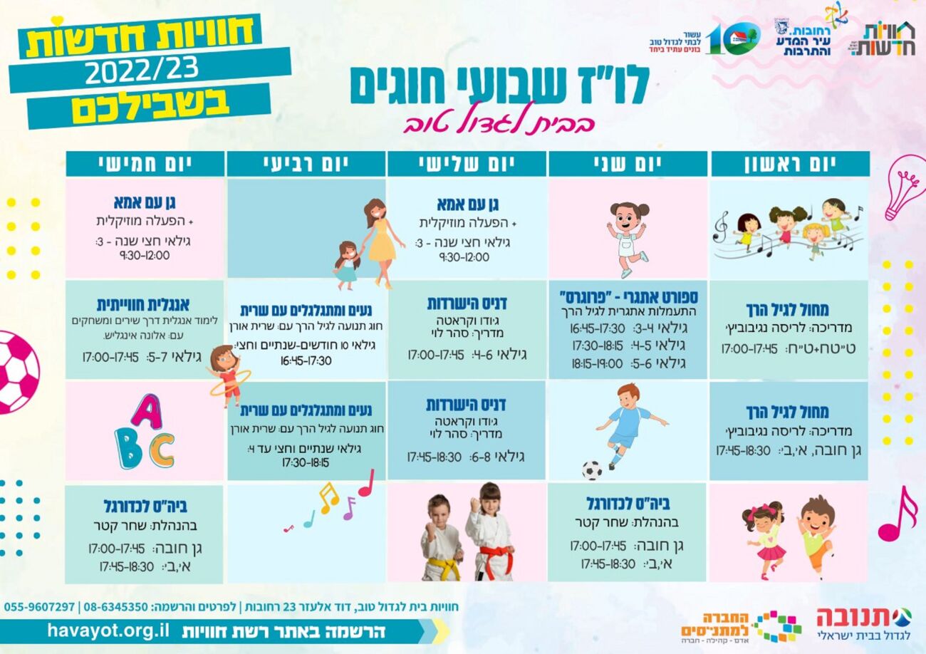 רשת חוויות ומרכז בית לגדול טוב פתחו בימים אלו את ההרשמה לשנת הפעילות 2022/23. התושבים מוזמנים להירשם לשלל הפעילויות והחוגים שיתקיימו במהלך השנה הקרובה: ספורט אתגרי, גן עם אמא, מחול לגיל הרך, בית ספר לכדורגל ועוד