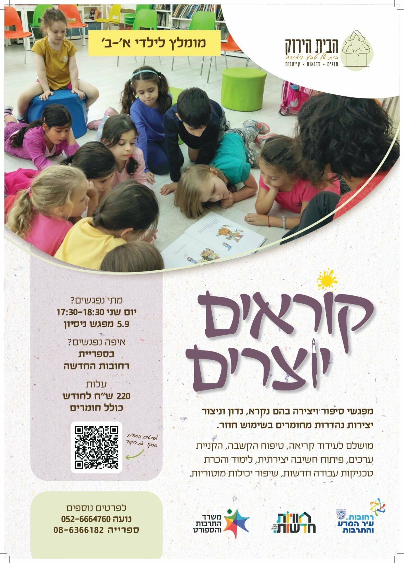 מפגשי סיפור ויצירה בהם נקרא, נדון וניצור יצירות נהדרות מחומרים בשימוש חוזר. הפעילות נועדה לעידוד הקריאה, טיפוח הקשבה, הקניית ערכים, פיתוח חשיבה יצירתית, לימוד והכרת טכניקות עבודה חדשות, שיפור יכולות מוטוריות.