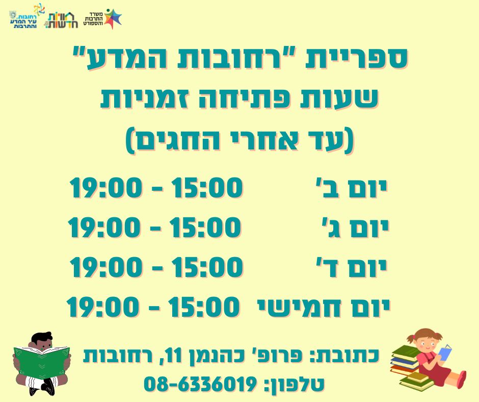 הספרייה תפעל בינתיים בימי שני עד חמישי בשעות אחר הצהריים