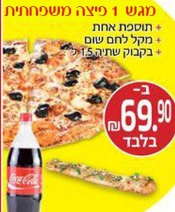 פיצה משפחתית +תוספת אחת+מקל לחם שום+בקבוק שתייה 1.5 ב- 69.90 ש"ח