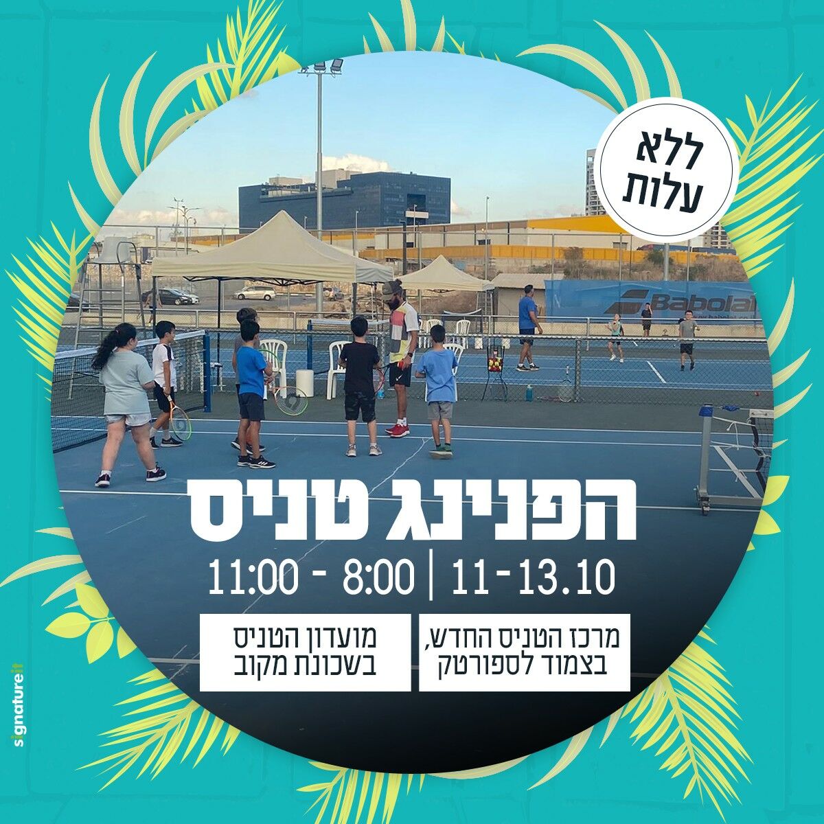 בשלישי-חמישי (11-13.10) בין השעות 08:00-11:00 במועדון הטניס הוותיק ברח' ישראל כנצלסון ובמועדון הטניס החדש הצמוד לספורטק (רח' בנימין קושילביץ 9). להרשמה ופרטים שלחו הודעה לדני ביאלר- 0544530756