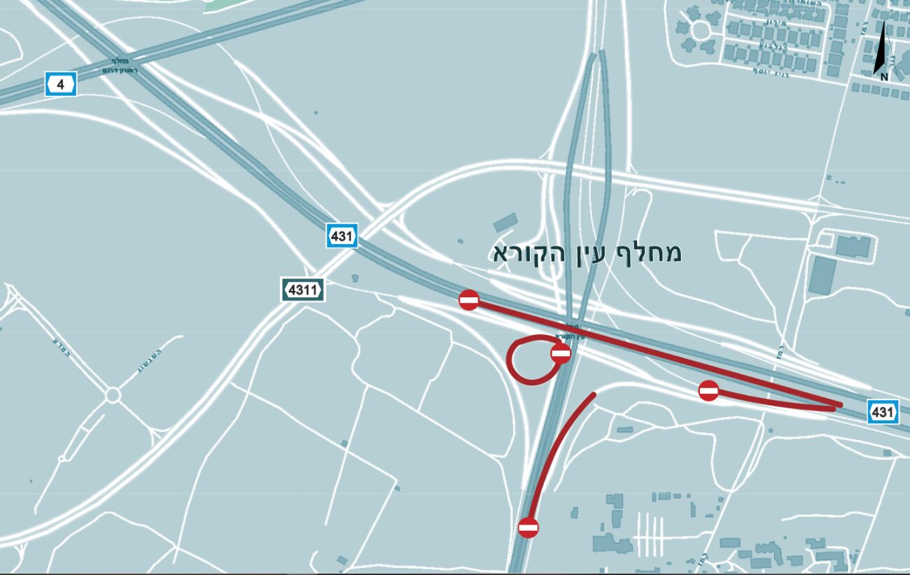 בליל יום חמישי 27.10.2022 החל מהשעה 21:00 ועד לשעה 09:00 בבוקר שלמחרת, ייחסם לתנועה כביש 431 בין מחלף עין הקורא למחלף באר יעקב/נס ציונה. רמפת הירידה למחלף עין הקורא לבאים מכביש 4311 לכביש 42 לדרום (יבנה) תיחסם!