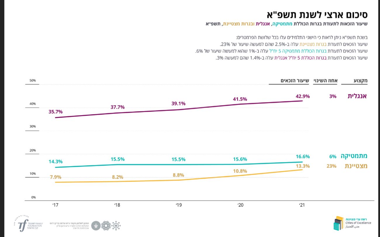 בשנים האחרונות מערכת החינוך בישראל יוצאת בתוכניות שונות לעידוד התלמידים לגשת למבחני הבגרות ב5 יחידות במקצעות האנגלית והמתמטיקה והמדעים. בין התוכניות הקיימות הן תוכנית של קרן טראמפ "ערי מצויינות", שיוצאת מידי שנה בקול קורא לרשויות המקומיות להצטרף לתוכנית. התוכנית קמה לאור הידרדרות מערכת החינוך במספר התלמידים שנגשו ל 5 יחידות בגרות במקצועות הנ"ל ומציעה לרשויות מענקים ופיתוח של תוכניות עירוניות בתחום המתמטיקה והמדעים.