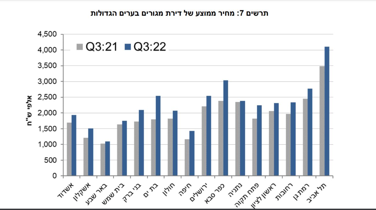 מחירי הדירות הממוצעות בערים הגדולות בישראל - השוואה בין רבעון שלישי 2022 לרבעון שלישי 2021