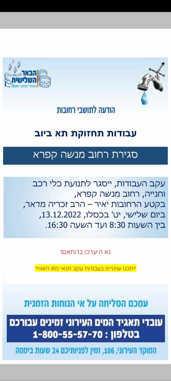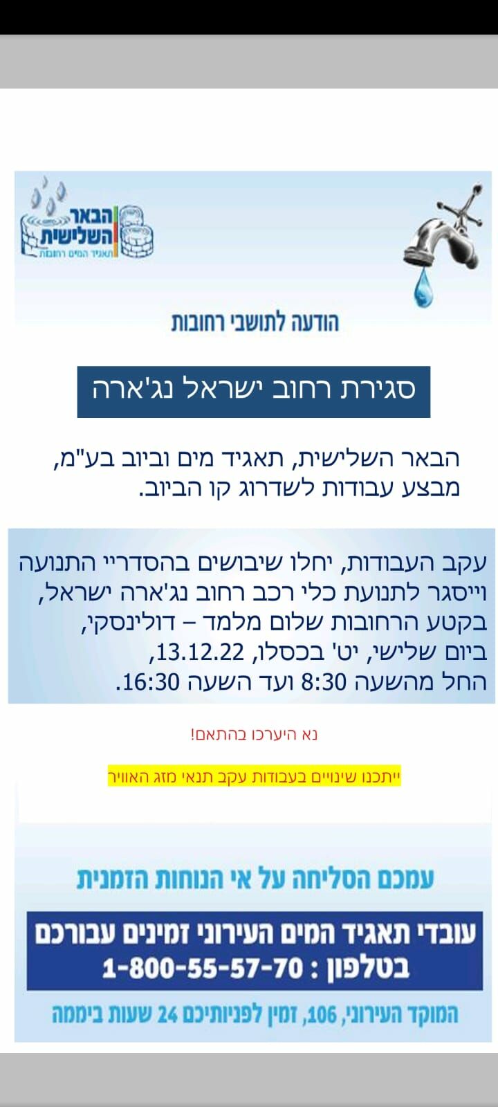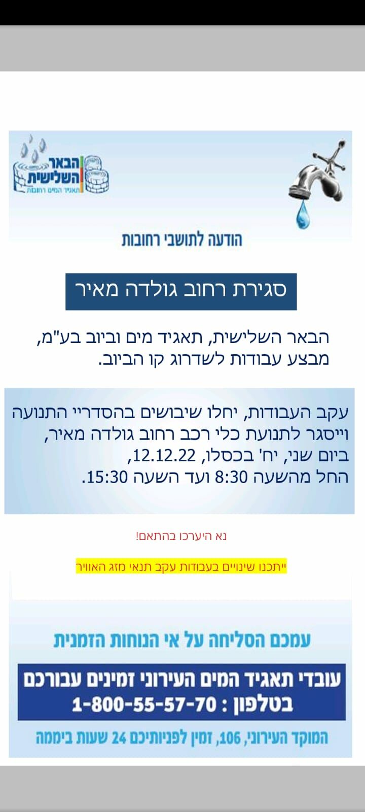 ביום שני 12.12.2022 החל מהשעה 08:30 ועד 15:30