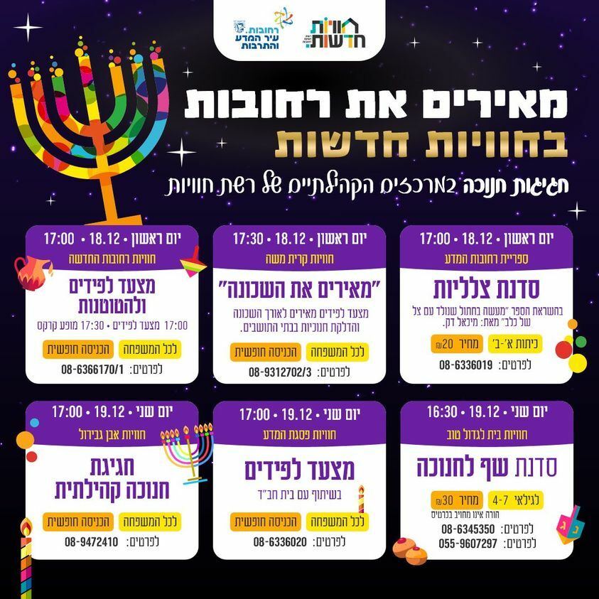 תוכנית אירועי חנוכה ליום שני 19.12 ברחובות: תהלוכת הלפידים של רשת חוויות, סדנת שף בבית לגדול טוב, מופע קרקס ומסיבת חנוכה של קהילת יבניאלי