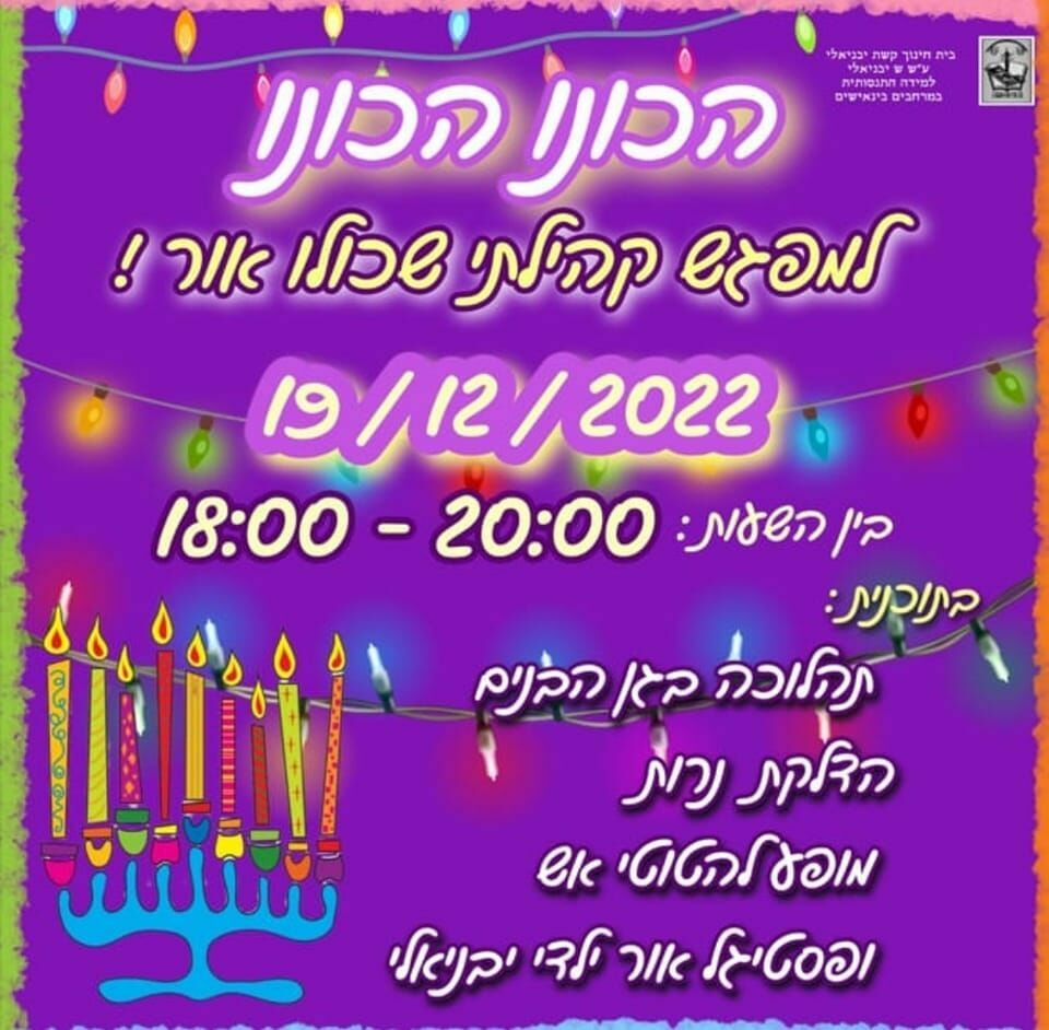 מרכז חוויות אבן גבירול וביה"ס בגין מזמינים אתכם לחגיגת חנוכה קהילתית של אור, צלילים ואנרגיה טובה. נצא לתהלוכה מוארת מרחבת המרכז לכיוון האולם הגדול מאחורי ביה"ס. התכנסות באולם להדלקת נרות חנוכה, מופע מקהלת ביה"ס בניצוחה של שלי מועלם ונקנח במופע קרקס ולדים מרהיב – חברת "מתנה אירועים"