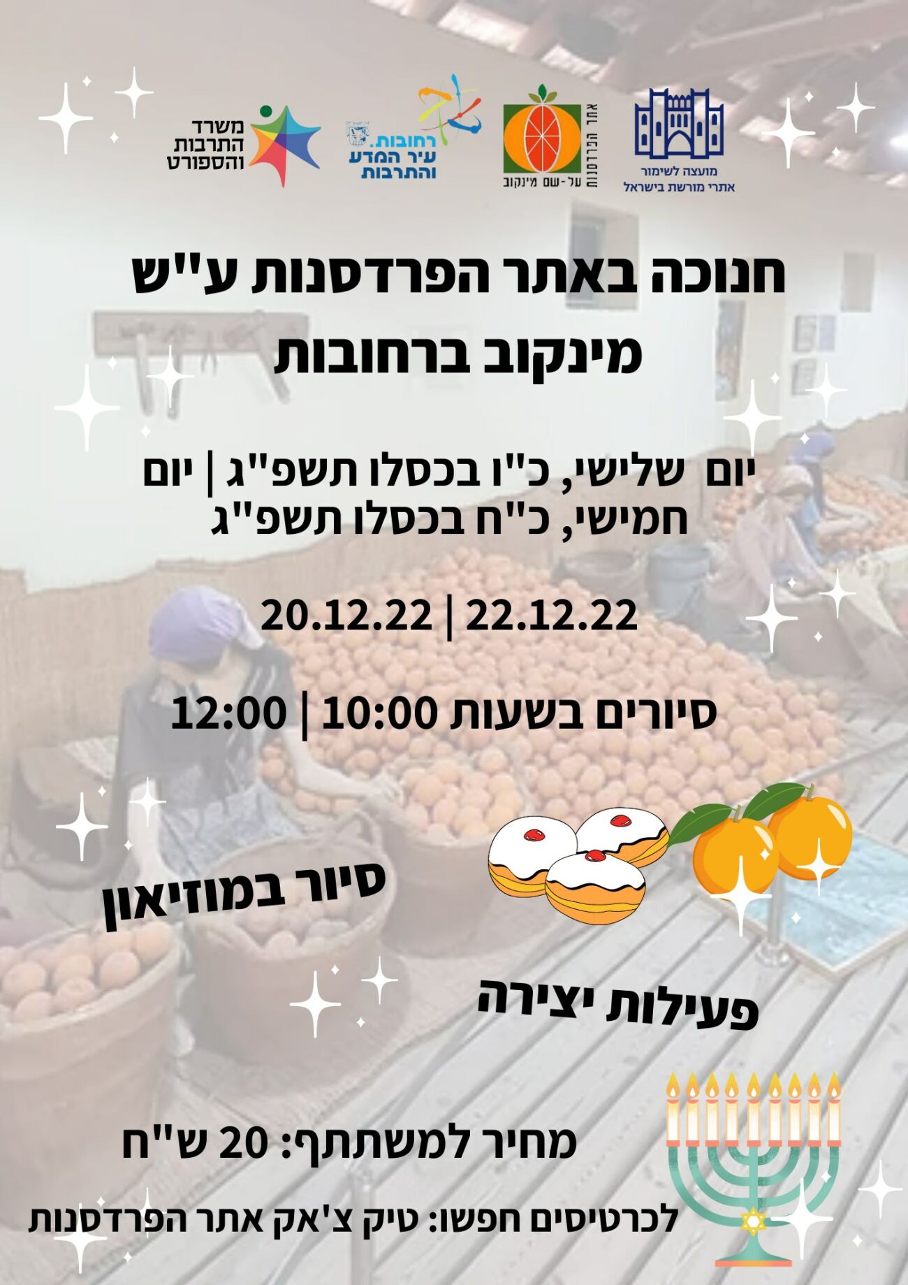 במהלך חופשת חנוכה יתקיימו באתר הפרדסנות סיורים לקהל הרחב בשעות הבוקר, בשילוב פינת יצירה המותאמת לילדים.