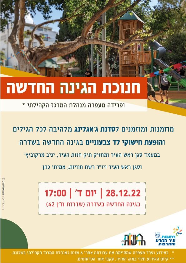 ביום רביעי 28.12 יתקיים טקס חנוכת הגינה החדשה בשד' חן יחד עם טקס הפרידה מעופרה גזית שניהלה את מתנ"ס שד' חן ב 6 השנים האחרונות