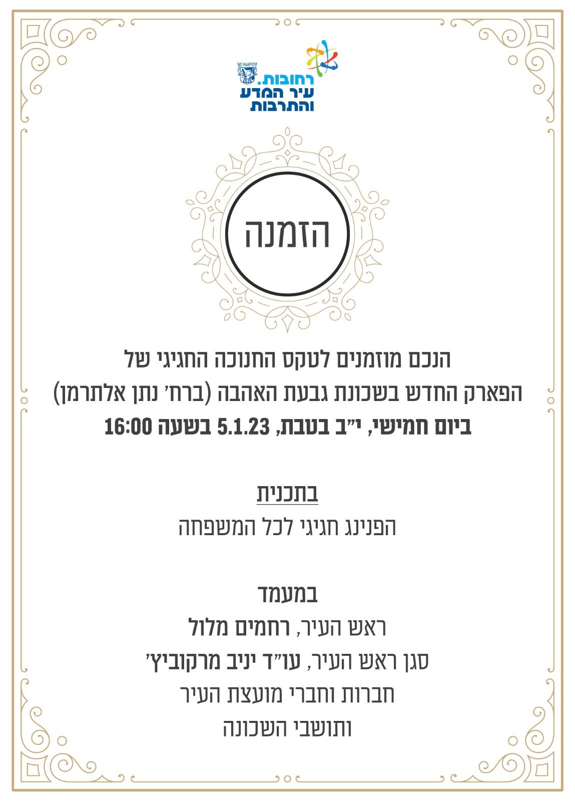 עיריית רחובות מזמינה את התושבות והתושבים לטקס הפתיחה הרשמי של פארק גבעת האהבה ביום חמישי 5.1.23 בשעה 16:00.