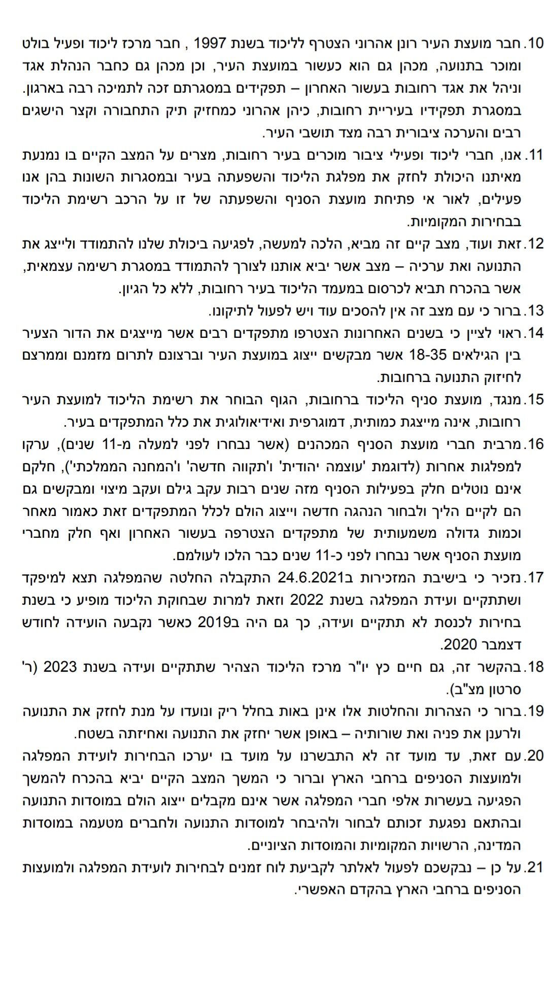 לדבריהם כבר מעל 11 שנים שלא נערכו בחירות לועידת הליכוד ולסניפים, דבר שגרם לכך שמתפקדים רבים שהצטרפו במהלך השנים אל הליכוד אינם יכולים לבחור ולהיבחר למועצות הסניפים (בהם צעירי העיר והליכוד). איטח ואהרוני בעצמם נאלצו להתמודד בבחירות האחרונות ברשימה עצמאית מאחר ולא התקיימו הבחירות למועצת הסניף ולטענתם הדבר פוגע בחיזוק תנועת הליכוד. הם מוסיפים ואומרים כי במועצת הסניף ברחובות יש רבים מחברי המועצה ערקו למפלגות/סיעות אחרות או אינם פעילים עוד וחלקם אף הלכו לעולמם. על כן הם מבקשים את התייחסותו המיידית על מנת לפתור את המצב.