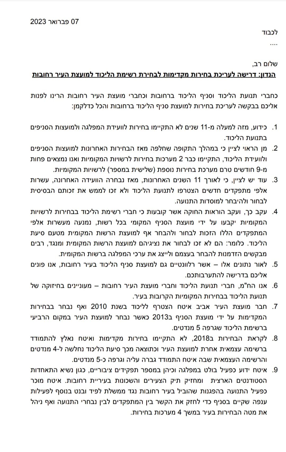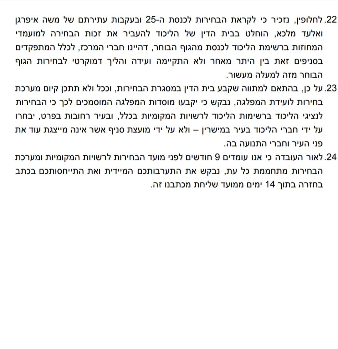 אביב איטח ורונן אהרוני שלחו מכתב לרה"מ ויו"ר הליכוד בנימין נתניהו בבקשה לקיום בחירות למועצות סניפי הליכוד ברחבי הארץ וברחובות בפרט.