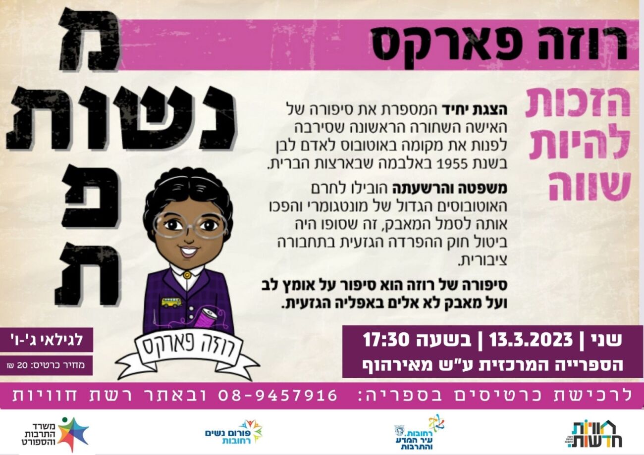 מחר (שני 13.3) תוצג בספרייה המרכזית ברחובות הצגת היחיד לילדים "רוזה פארקס - הזכות להיות שווה" על האישה השחורה שבזכותה בוטל החוק להפרדה גזעית בתחבורה הציבורית בארה"ב