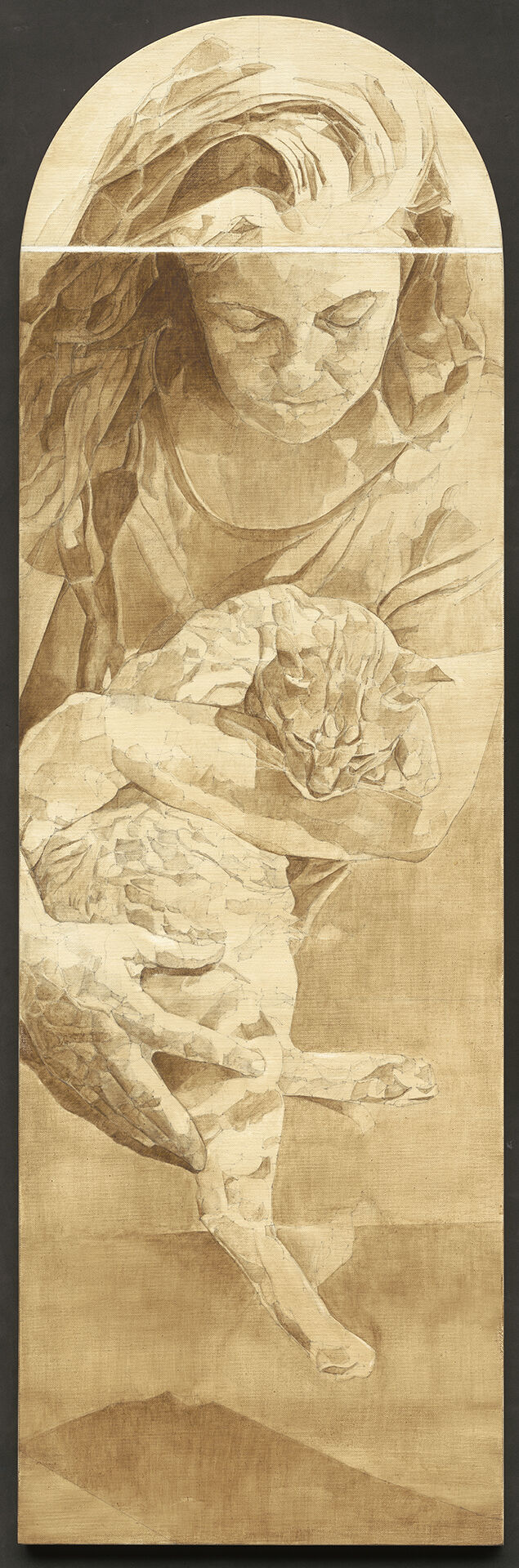 יוסי מרק, "המדונה של החתולים", 2013-15, אקריליק ושמן על בד מודבק על גבי עץ, 123X38.6 ס"מ,