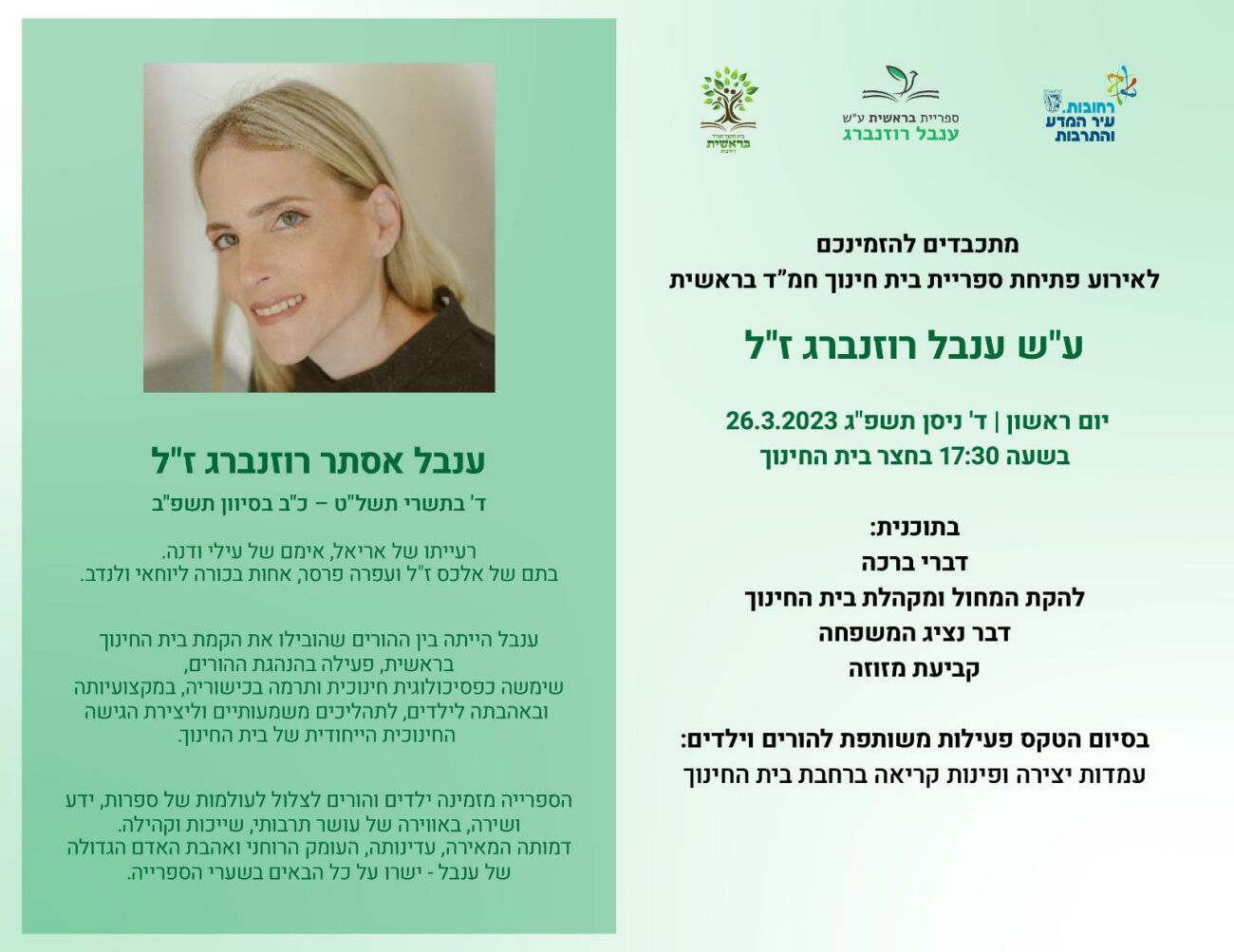 בית ספר בראשית ברחובות חנך את הספרייה החדשה לזכרה של הפסיכולוגית החינוכית וממקימות בית הספר, ענבל רוזנברג ז״ל
