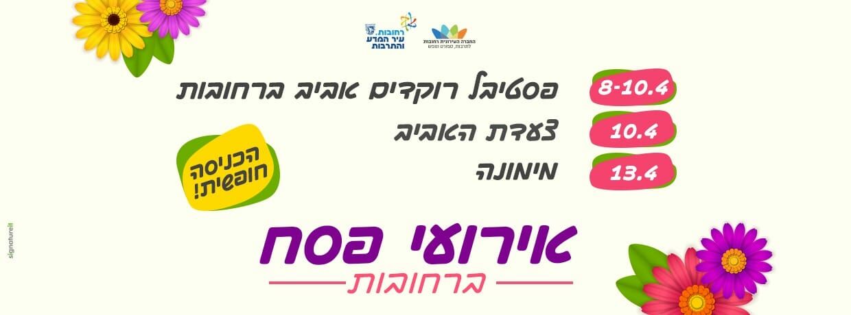 עיריית רחובות והחברה העירונית מקיימים בחול המועד פסח את פסטיבל "רוקדים אביב ברחובות" בפארק המייסדים. במהלך ימי הפסטיבל, יתקיים מופע קצבי אינטראקטיבי לכל המשפחה בבית העם רחובות - היכל התרבות העירוני, שני מופעי זמר ומחול על הבמה המרכזית בפארק המייסדים, עם מיטב אמני הזמר, להקות המחול העירוניות "הדרי רחובות" ולהקות מחול מכל הארץ.