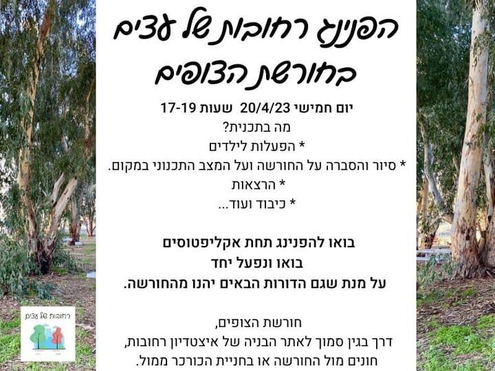 ביום חמישי 20.4 תקיים קהילת רחובות של עצים הפנינג לכל המשפחה בחורשת הצופים